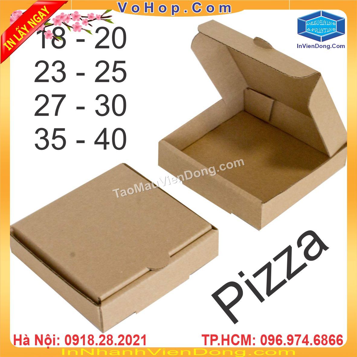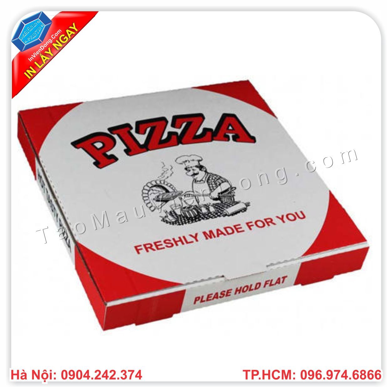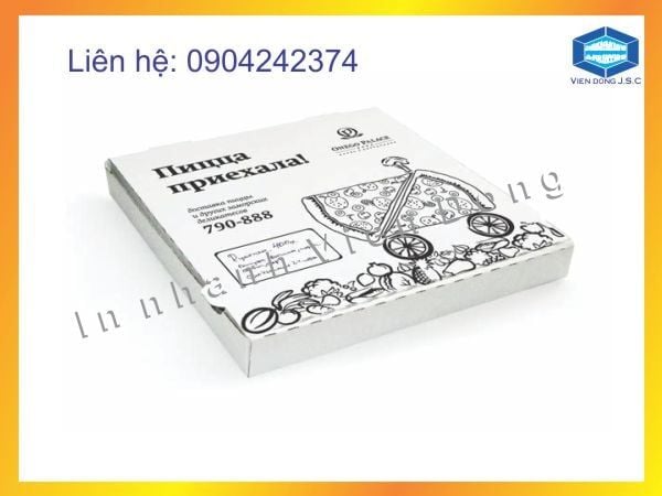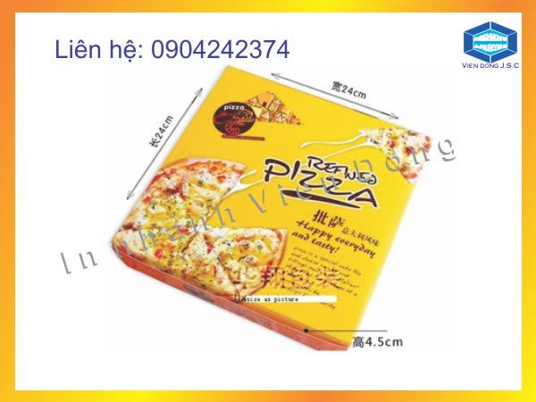 Pizza là món ăn được khá nhiều giới trẻ ưa thích. Ngoài việc đến cửa hàng ngồi ăn, thì rất nhiều người không tiện đi lại nên gọi ship. Nhiều cửa hàng muốn khi bánh đến tay người sử dụng phải vẫn còn nóng, không bị bóp méo bánh, không bị chảy bánh... Thì chúng tôi, công ty in Viễn Đông chuyên cung cấp, bán sẵn và in hộp giấy đựng Pizza đảm bảo chất lượng, chất liệu cứng cáp, in ấn được hình ảnh logo thương hiệu của chính bạn. Mà giá thành chỉ từ 3000đ
