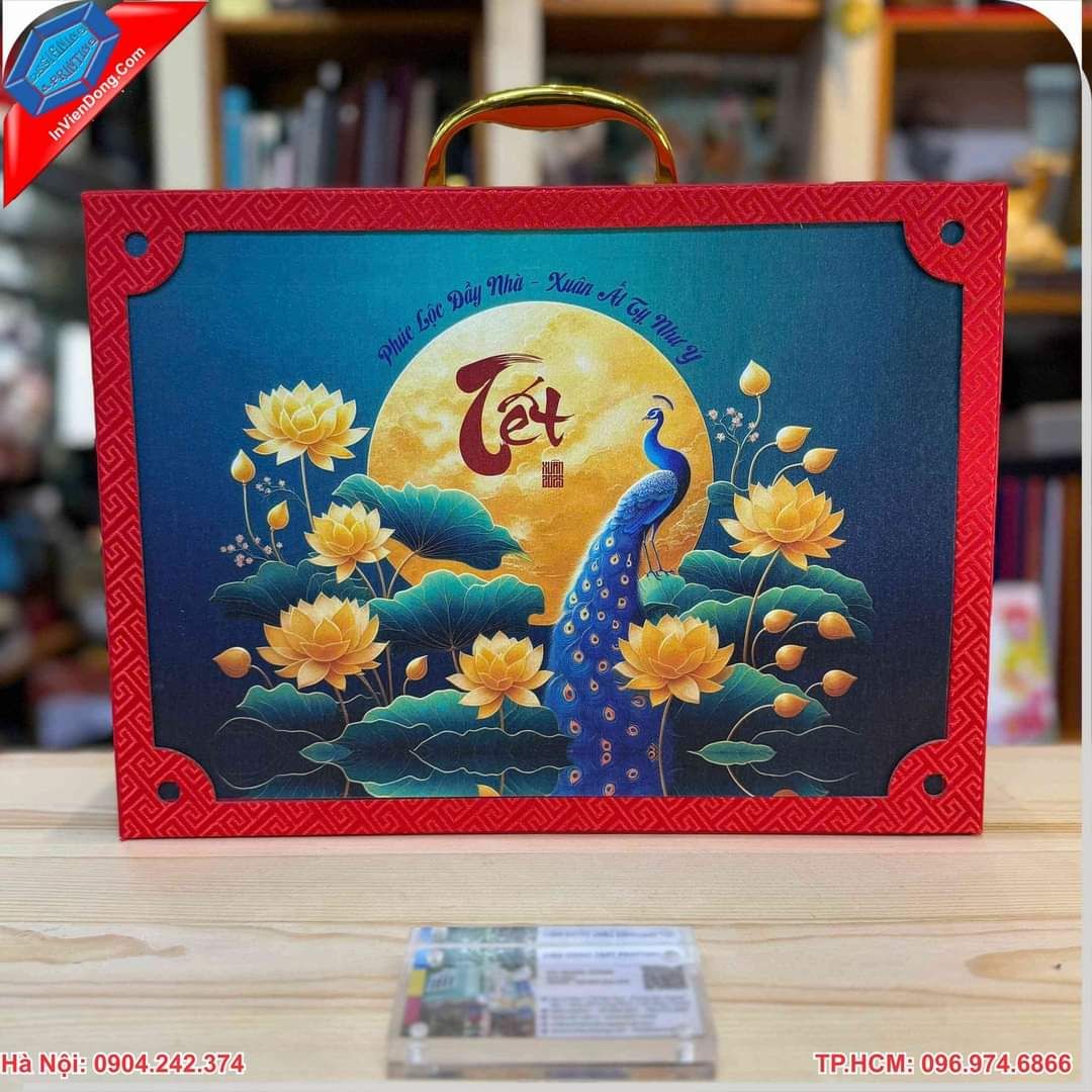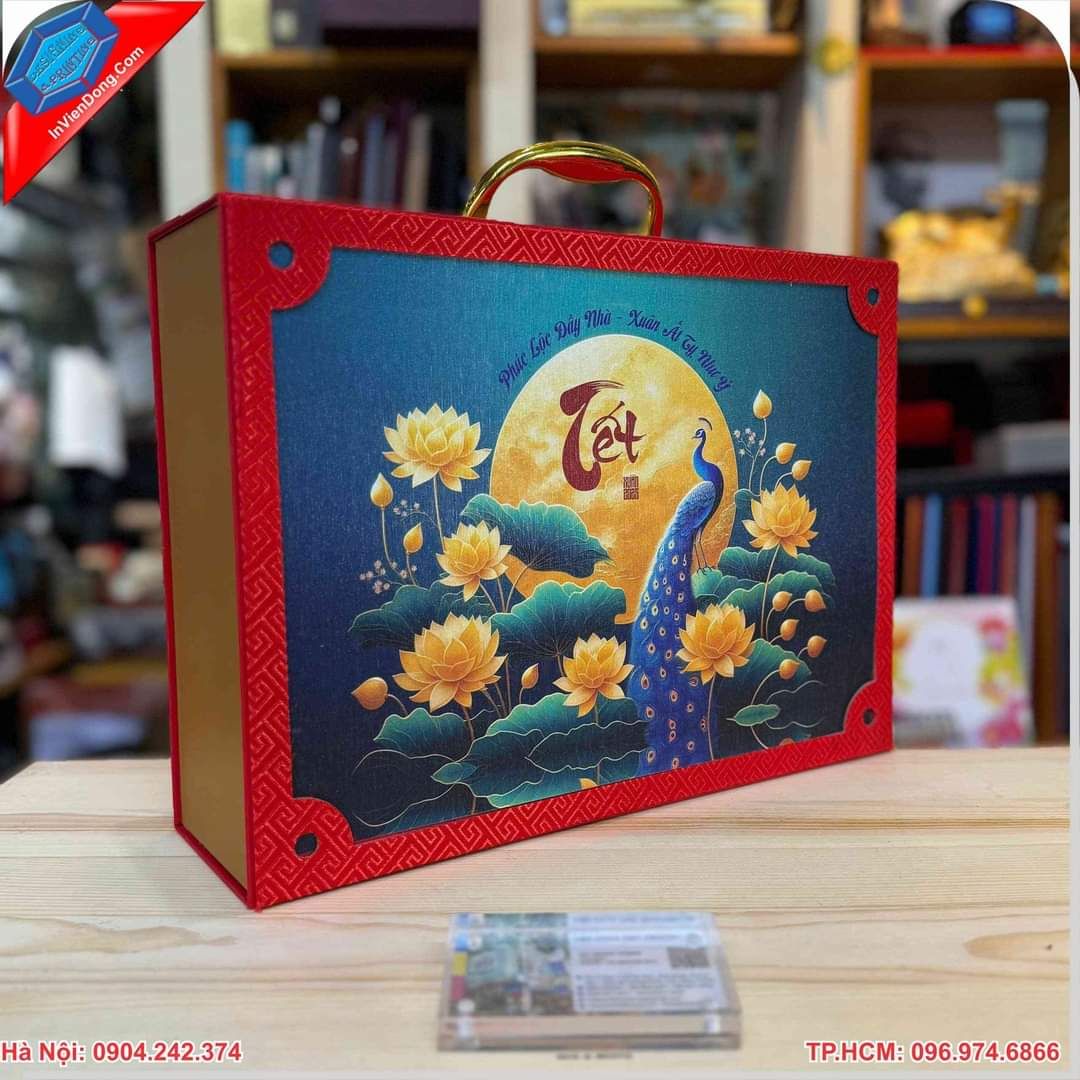 Hộp đựng quà tết là một loại bao bì vô cùng đặc biệt, hộp được thiết kế để đựng, trưng bày những các món quà tặng vào mỗi dịp Tết đến. Chúng thường có các kích cỡ đa dạng, màu sắc bắt mắt thể hiện đặc trưng của ngày Tết. Đa phần những chiếc hộp đựng quà Tết được trang trí bởi các họa tiết như hoa đào, hoa mai hay câu đối đỏ hoặc con công, con phượng để khiến hộp đựng quà Tết trở nên độc đáo và sang trọng hơn rất nhiều.