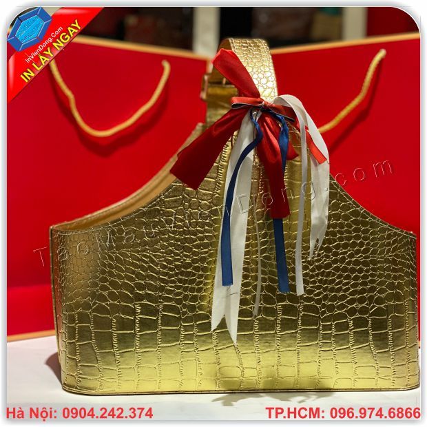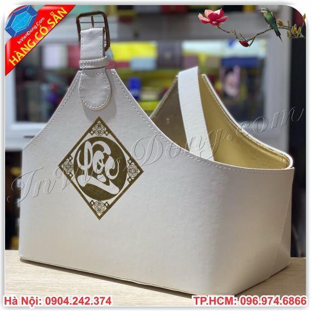 Những chiếc giỏ da đựng quà tết có thêm phụ kiện và nơ hoa bọc giấy bóng kính có họa tiết hoa mai hoa đào ngày xuân sẽ là sự lựa chọn vô cùng thông minh cho những người đi biếu tết hoặc các doanh nghiệp tặng cho đối tác. Sự bền đẹp chắc chắn và tái sử dụng được nhiều lần rất tiện dụng. NgoaÌ ra có thể in mạ nhũ và thúc nổi dập chìm logo để quảng bá và nhận diện thương hiệu vô cùng hiệu quả