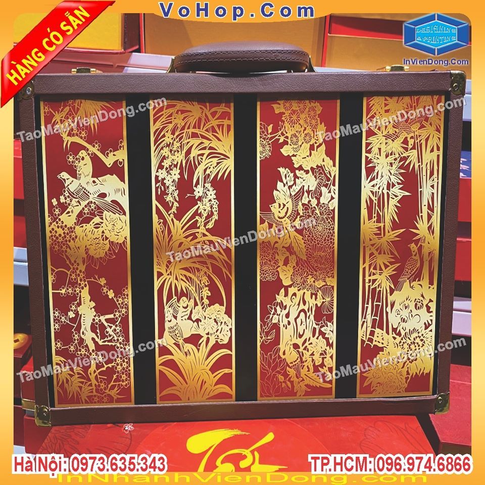 | Quy cách | Hộp đựng quà tết cao cấp âm dương , hộp dây móc có khóa nam châm từ tính có cắt bóng kính mạ nhũ vàng hay nhũ bạc thúc nổi 3D hoa sen, hoa mai,cành đào ... | |