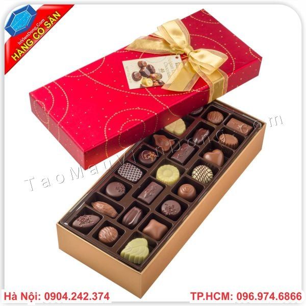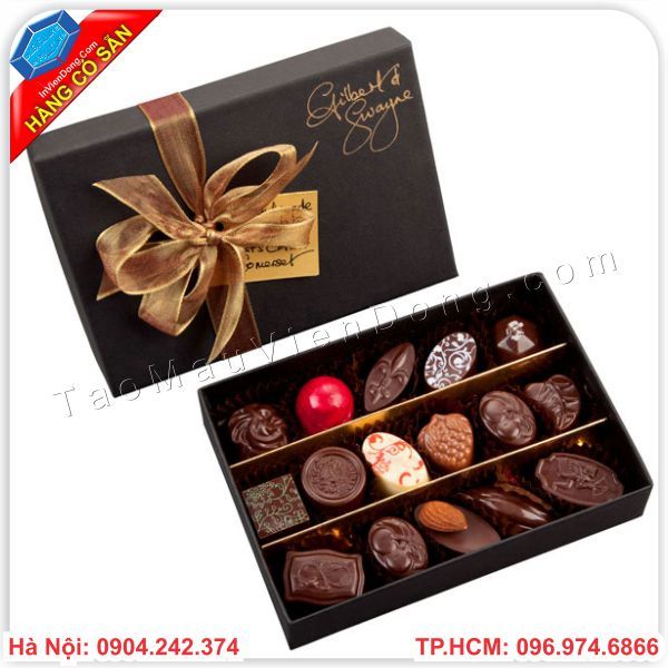 Hãy đến với công ty In ấn Viễn Đông chúng tôi với nhiều kiểu hộp đựng quà socola đẹp, sang trọng, nhiều mẫu mã đa dạng, kích thước vừa phải vừa vặn với món quà và có thể sử dụng để đựng socola và nhiều loại quà khác. Sử dụng chất liệu giấy carton lạnh giúp hộp cứng cáp, bền đẹp và chắc chắn hơn và được phủ lên một lớp giấy mĩ thuật thẩm mỹ cao cấp. Bạn không phải lo lắng về mẫu hộp đựng socola bên chúng tôi.