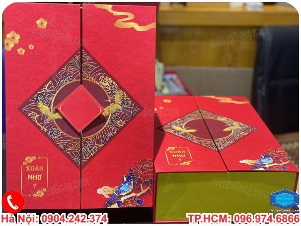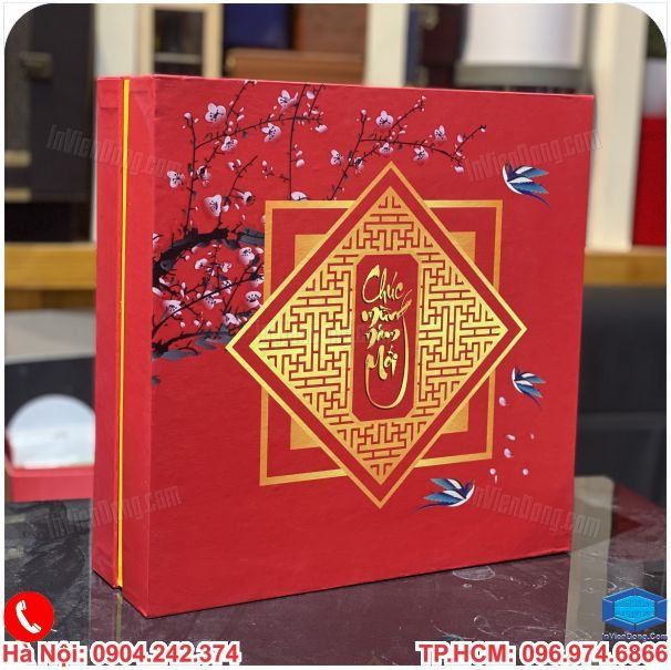 | Quy cách | Hộp đựng quà tết cao cấp âm dương , hộp dây móc có khóa nam châm từ tính có cắt bóng kính mạ nhũ vàng hay nhũ bạc thúc nổi 3D hoa sen, hoa mai,cành đào ... | |