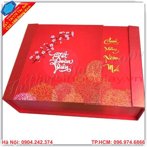 Hộp giấy đựng quà tết được xem là phần quan trọng thể hiện tính trang trọng, tạo nên sự bất ngờ cho chủ nhân của món quà. Với công nghệ in ấn sản xuất thành phẩm, kèm theo sự phát triển của ngành công nghệ giấy bồi, carton, giấy mỹ thuật đã giúp tạo ra những chiếc hộp giấy theo ý muốn khác nhau, đáp ứng mọi nhu cầu của khách hàng.