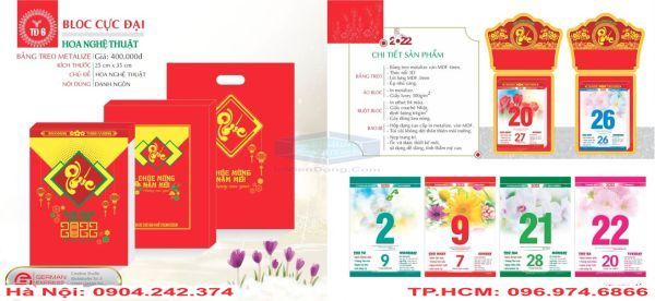 Mẫu lịch bloc cực đại được Viễn Đông chúng tôi thiết kế với dạng 365 ngày bao gồm có một tờ bìa và 365 tờ lịch tương đương với cả năm. Và trên mỗi tờ lịch sẽ được in đầy đủ các thông tin bao gồm ngày tháng năm cả dương lịch lẫn âm lịch. Ngoài ra lịch còn sẽ được in thêm các câu thơ hoặc danh ngôn lên đó. Còn về phần kích thước thì lịch sẽ được thiết kế tùy theo yêu cầu của từng khách hàng. Đối với chất liệu giấy thì phần ruột lịch sẽ được sử dụng giấy Coucher matt 70gsm và in offset 4 màu, có thể nói đây chính là một trong những loại giấy được sử dụng nhiều nhất để in lịch. Ngoài ra chúng tôi còn có túi và hộp để đựng lịch. Hộp giấy đựng lịch sẽ được in metalize hologam 7 màu và thành phẩm theo công nghệ mới ép nổi 3D và túi giấy đựng lịch Duplex in offset 4 màu cán màng PE.