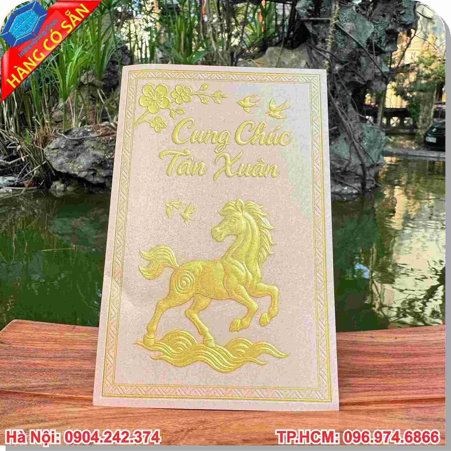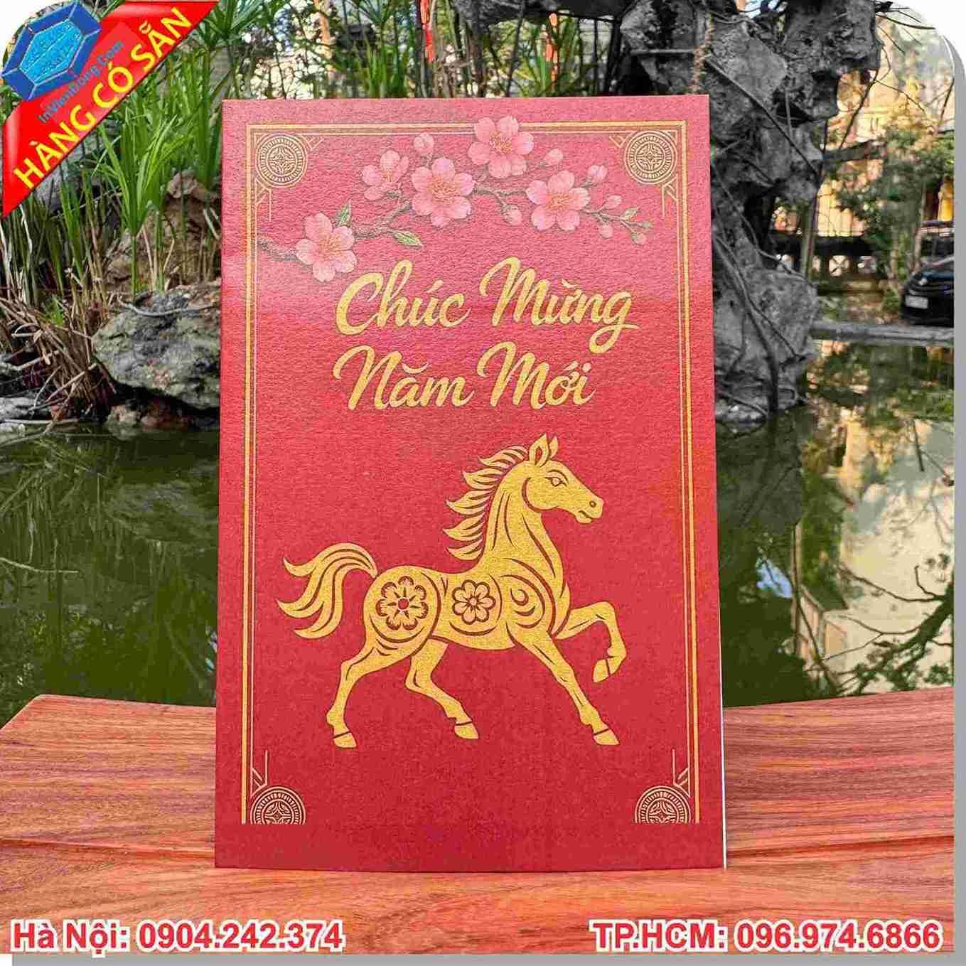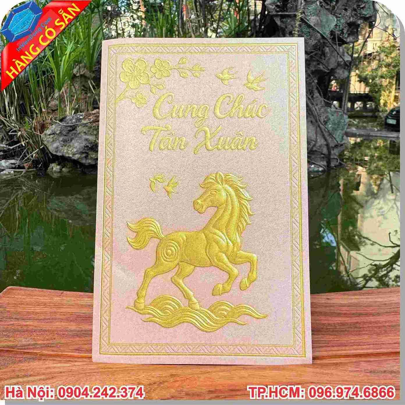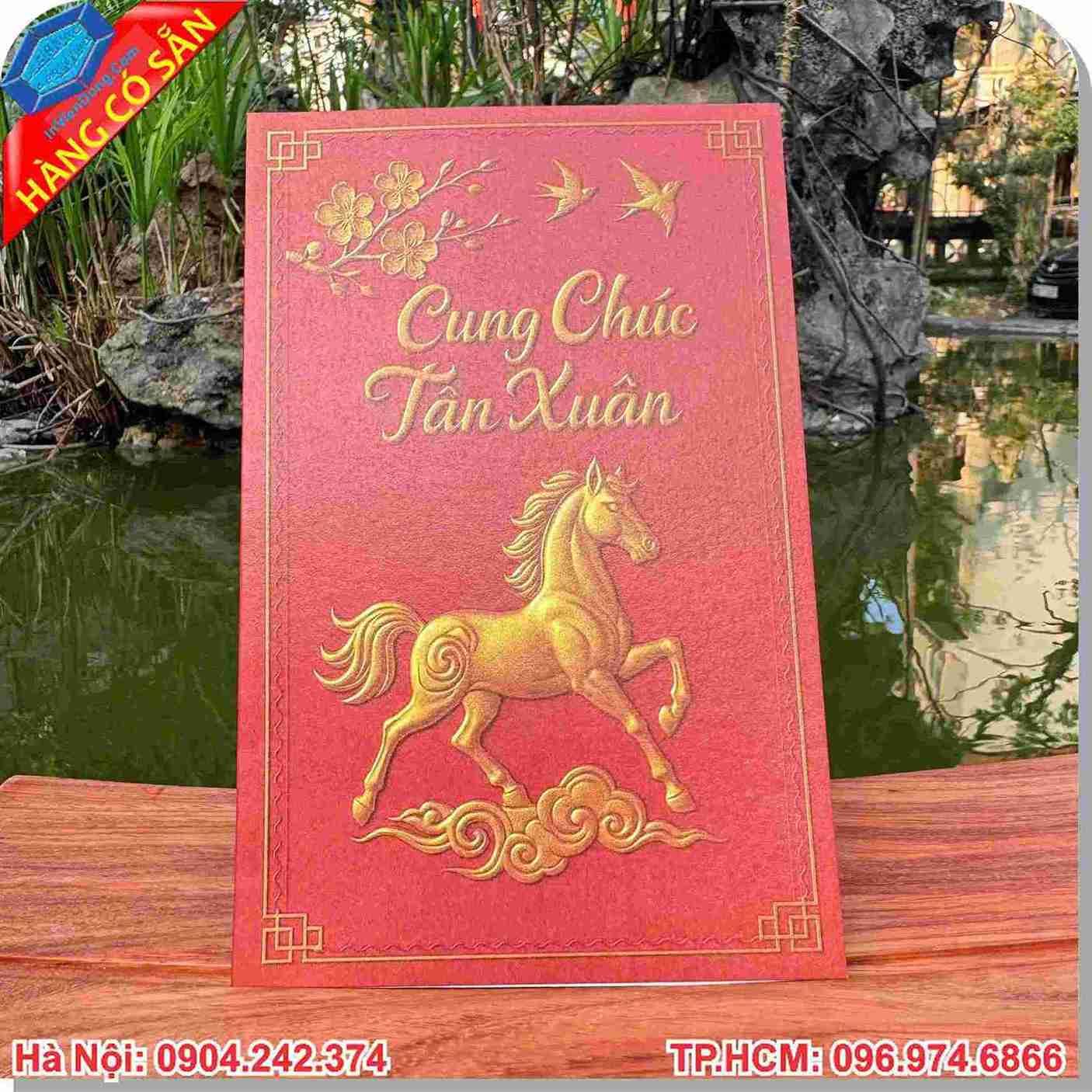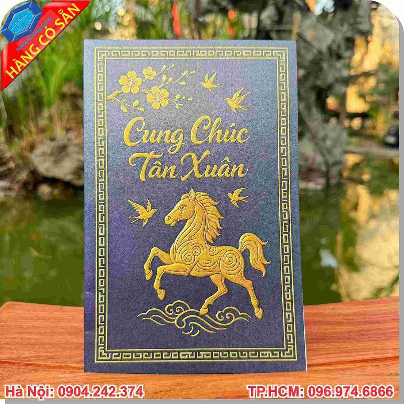 Kỹ thuật ép kim (Gold Foil): Tạo hiệu ứng ánh kim rực rỡ trên các họa tiết hoa mai, linh vật ngựa vàng, mang lại vẻ ngoài vô cùng thượng lưu.