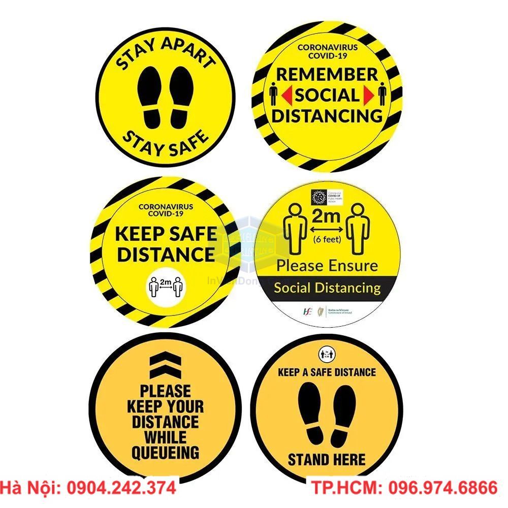 Theo như mọi người đã biết thì tình hình hiện nay tất cả mọi người trên toàn nước ta đang ra công tác thực hiện phòng chống dịch covid-19. Do dịch bệnh ngày càng ra tăng mạnh hơn nên tất cả mọi người dân đều đang bước vào giai đoạn thực hiện giãn cách xã hội. Tránh ra ngoài đường khi không thực sự cần thiết, rửa tay với nước sát khuẩn thường xuyên và đeo khẩu trang mỗi khi ra ngoài đường. Không nên tụi tập nơi đông người và đứng cách nhau tối thiểu từ 1,5-2m. Để phòng chống dịch covid-19 hiệu quả hơn công ty In Nhanh Viễn Đông chúng tôi đã cho ra mẫu tem decal dán phòng chống covid-19. Loại tem decal này được in các hình dạng ký tự hình bàn chân hay các dòng chữ cảnh báo và phòng chống covid. Decal hình bàn chân dùng để dán lên sàn giúp mọi người biết được vị chí mình cần đứng ở đâu khi đang trong giai đoạn giãn cách xã hội hiện nay và nó thường được dán ở những nơi đông người như trong siêu thị, thang máy, xưởng nhà máy, công ty,... Còn loại decal cảnh báo in chữ thường in những cách giúp mọi người phòng tránh covid-19 và sẽ được gắn ở những nơi công cộng để mọi người dễ nhìn thấy.